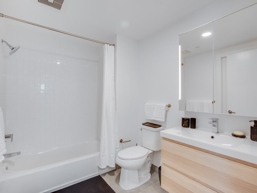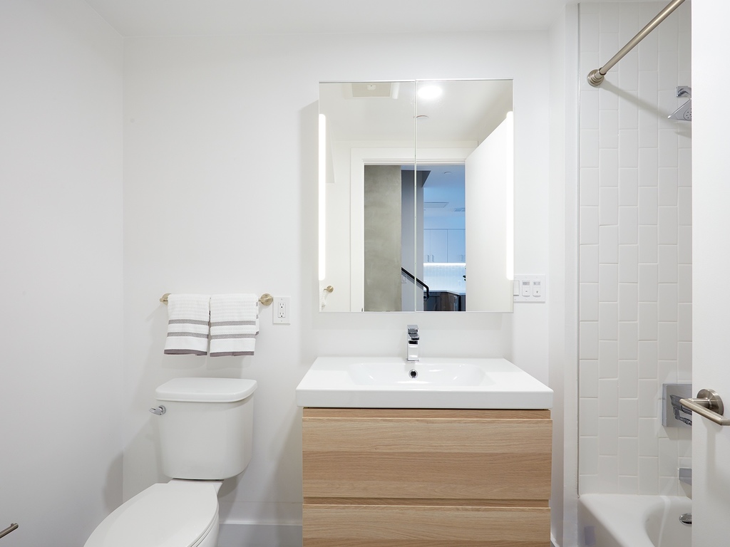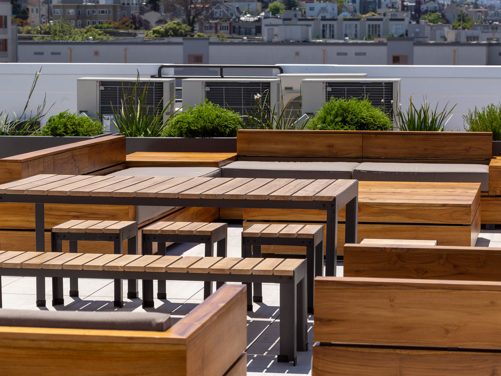 Private outdoor patios for ground floor units and an open-air rooftop with a custom outdoor kitchen, furniture and landscaping offer residents a peaceful escape amongst their fast-paced, urban surroundings.